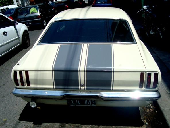 ¡Un Taunus Shelby! Salí corriendo al auto, agarré la cámara y comencé a disparar sobre esta criatura tan burda como intrigante, y seguramente tanto o más apetitosa para nuestra sección kitsch que el mismísimo especial de crudo y queso. Como verán, el truco de la triple luz trasera fue ingeniosamente resuelto por el artista que, con pocos recursos, logró un efecto notable. Las infaltables franjas decorativas del modelo, rematan un posterior para la ovación de todo el barrio. Pido como ejercicio final al lector entrecerrar los ojos en las dos primeras fotos, y verán lo que vi en la calle. Sin salir corriendo a decir que es un Mustang Fastback, nos genera un frío y lánguido momento de duda que nos recorre de punta a punta, llenando nuestros bolsillos de preguntas.