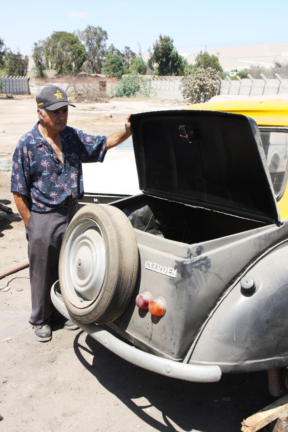 Pregunta va, respuesta viene, fui atando cabos sobre la razón de su existencia. Al día siguiente conseguí incluso ubicar, también en estado de semi abandono, a otro 2 CV con baúl. Pero este estaba mucho más completo, y su esquema de pintura (carrocería negra y techo amarillo), confirmaba lo que me habían contado algunos de los personajes inquiridos: en Arica funcionaron como taxis.