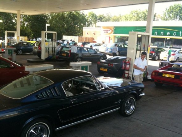 Ford Mustang Fastback, y Ferrari 512 BB cargando nafta. El Lotus de fondo no cuenta. Es nuevo…