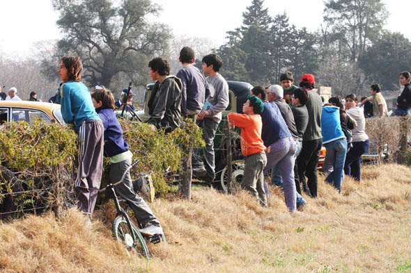 ¿La final de la liga juncalense de fútbol? ¿El clásico bochófilo del pueblo? ¿Una carrera de TC? No, la gente joven de Juncal es tan entusiasta que se trepa así al alambrado para ver las pruebas de habilidad conductiva del rally.