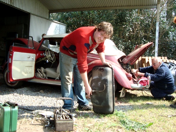 Hernán Charalambopoulos - 02/09/2010Ruedas montadas, y a tirar para sacarlo…Ejem… las ruedas están clavadas. Uh….Martillito, golpes, una, dos tres, todas desbloqueadas, menos una. Igual lo arrastramos afuera y allí comenzó la tarea de ponerlo en marcha. Para eso se necesita nafta, y la que había en el tanque descansaba allí desde hacía unos ocho años. Resultado: sacar el tanque, limpiarlo, y llenarlo nuevamente de combustible nuevo. Rudy en tanto, hacía malabares con correas, tuercas, bobina y demás. Daba la imagen de un cavernícola buscando la chispa justa para hacer el fuego, aunque aquí golpeteaba para que los platinos, distribuidor y demás instrumentos eléctricos hablasen el mismo idioma.