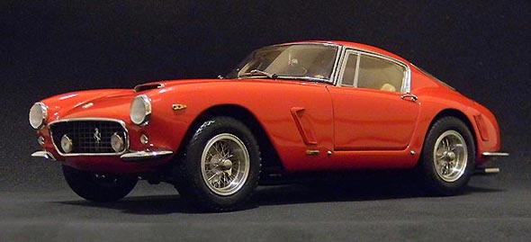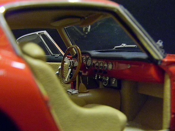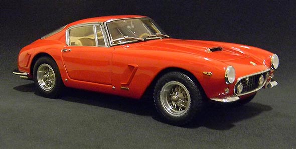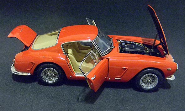 Esta 250 es fabricada por la marca alemana CMC, está construída con 1141 piezas diferentes, la mayoría de ellas metálicas. El interior está tapizado en cuero con costuras reales. El V12 Colombo tiene un nivel de detalle asombroso. Las ruedas con las llantas Borrani de finísimos rayos y tuerca central, permiten sacarlas y ver los frenos en detalle.
