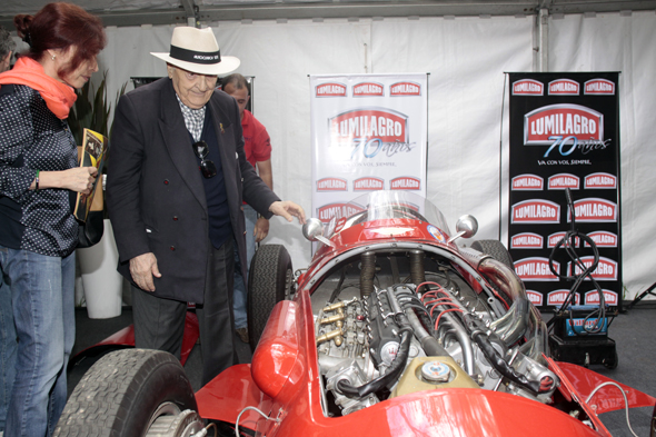 Froilán se detuvo brevemente frente a la Ferrari 166 de Fuerza Libre que condujera cobijado bajo el equipo del Automóvil Club Argentino. Y continuó viaje hacia la carpa de monopostos donde lo esperaba la Maserati 250 F con la que participó en el Gran Premio de la República Argentina en el año 1956. Froilán besó chapa santa, fue agasajado con un cuadro de aquella competencia y se mostró, como en toda la jornada muy dispuesto a la charla y a la firma de autógrafos.