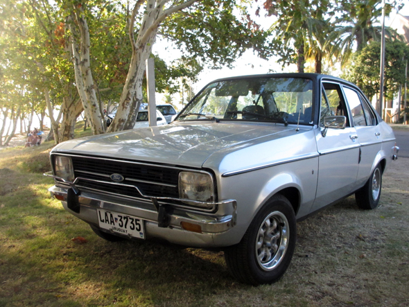 La producción del Escort comenzo en Uruguay en 1970 con el MK I en versiones 1100 y 1300cc de dos o cuatro puertas. Este modelo se descontinuó a comienzos de 1974 con la versión 1300 GT que llevaba un Weber de doble boca y llantas 12′. Hasta ahí ya se había cimentado buena fama en competencias de rally, incluyendo dos victorias en el 19 Capitales. La producción se retomaría en 1977 luego de la muerte de Groucho Marx, con el Mk II que compartía la misma plataforma y resolución mecánica en general. Incluso la evolución de las torres traseras de amortiguador ya se adelantaba en el modelo de 1974. En Ford Uruguay este Mk II (proyecto Brenda)se motorizó con el Kent 1600cc varillero, Weber doble y llantas 13′. Las carrocerías eran también de dos o cuatro puertas en la versión Sport y había también una versión Ghia de cuatro, que es la de las fotos.
