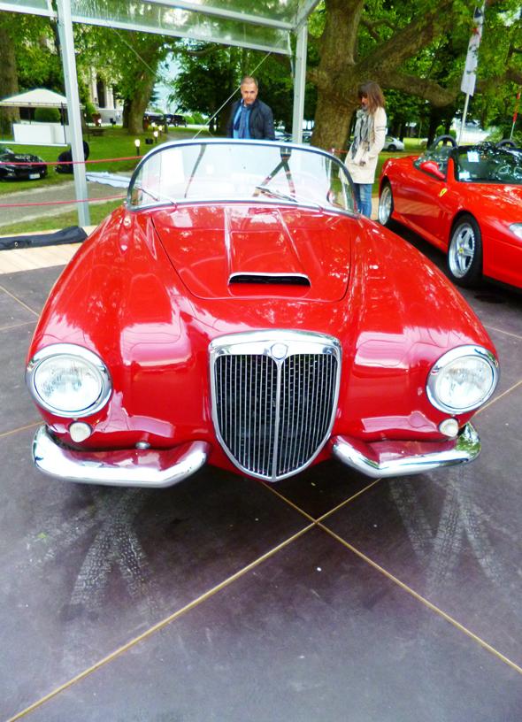 En un hermoso color “rosso Lancia” con interiores en cuero color “biscotto”, paragolpes divididos, parabrisas náutico tipo Riva Acquarama, ruedas de rayos Borrani, sin manijas externas para no arruinar la línea… Uno de los pocos ejemplares con volante a la izquierda.Concorso d’Eleganza di Villa d’Este, Cernobbio, Como, Italia.