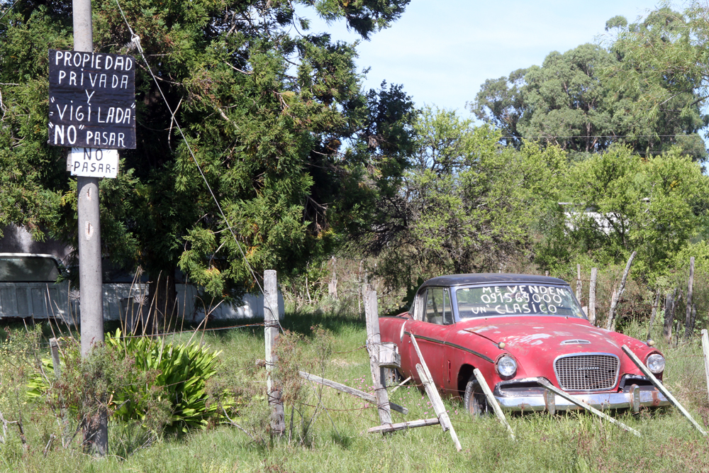 Junto a la ruta, sobre una alfombra verde y frente a una casa semi abandonada con unos cuantos carteles que invitan a no saltar el alambrado (las disculpas del caso al propietario…), está esta cupé colorada, junto al testimonio manifiesto de su propietario por seguir adelante por caminos que se bifurcan.