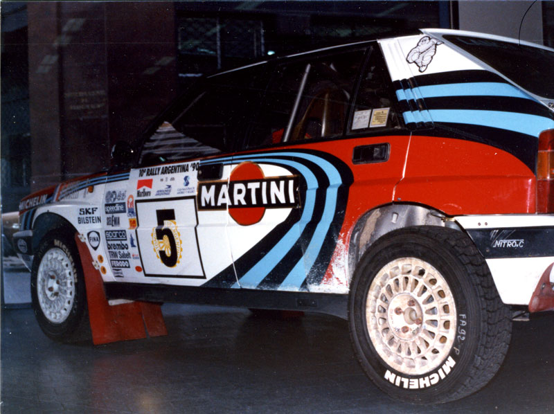 Iba medio almanaque de 1990 y yo cursaba tercer año en el Colegio Nacional de Buenos Aires en el barrio de Monserrat. Para volver a mi casa en Parque Patricios me tomaba el 28 por Bolívar en frente del City Hotel. Un día, no recuerdo si por un paro o por algún corte de calles cerca del cabildo, el 28 no pasaba por donde lo hacía regularmente, así que me dispuse a caminar unas cuadras en busca del 9. Di la vuelta manzana, saludé a Roca que seguía duro arriba del caballo y empecé a caminar por Diagonal hacia Av. Belgrano. De repente, entre los colectivos que pasaban logro ver con el rabo del ojo unos colores conocidos, hermosos, emocionantes, bellos como ellos solos, especialmente por la manera de estar ordenados y el lienzo donde habían sido pintados. Giré la cabeza y vi algo que me llevó unos segundos creer. Dos Lancia Delta con la «livrea» Martini. Era ya casi la una del mediodía y por un momento pensé que el hambre me estaba haciendo alucinar. Crucé la calle hacia Moreno, y ahi estaban, en la vidriera de lo que por entonces era la agencia Sevel Ernesto P. Améndola, el número 3 de Biasion – Siviero y el 5 de Auriol – Occelli. No recuerdo cuántas veces me habré frotado los ojos, pero es el día de hoy que no termino de entender esta casualidad. ¡Estaban ahí! Habían estado ahí durante días, antes y después del rally, a pasos de mi pupitre abulonado al piso y yo, ignorante de esta situación, sentadito toda la mañana como si nada.