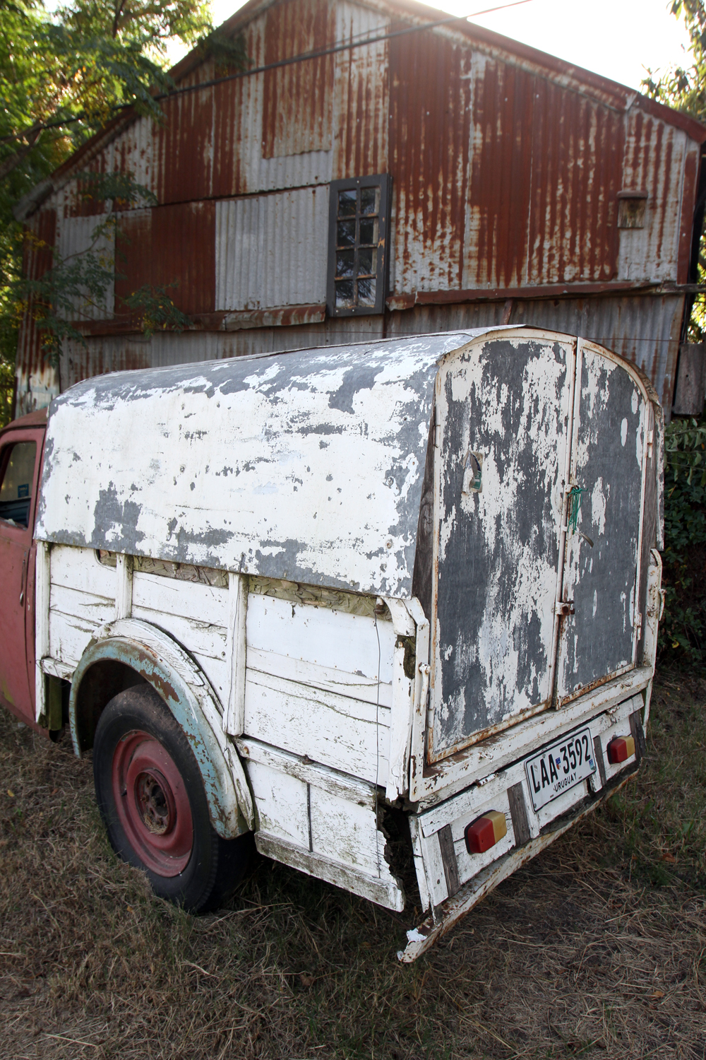 Esto lo pensaba incluso antes de encontrarme con esta chatita Simca 8 de la época, abandonada a la buena del sol, el agua y el glifosato frente a un galpón con el que parece prestarse los factores oxidantes.