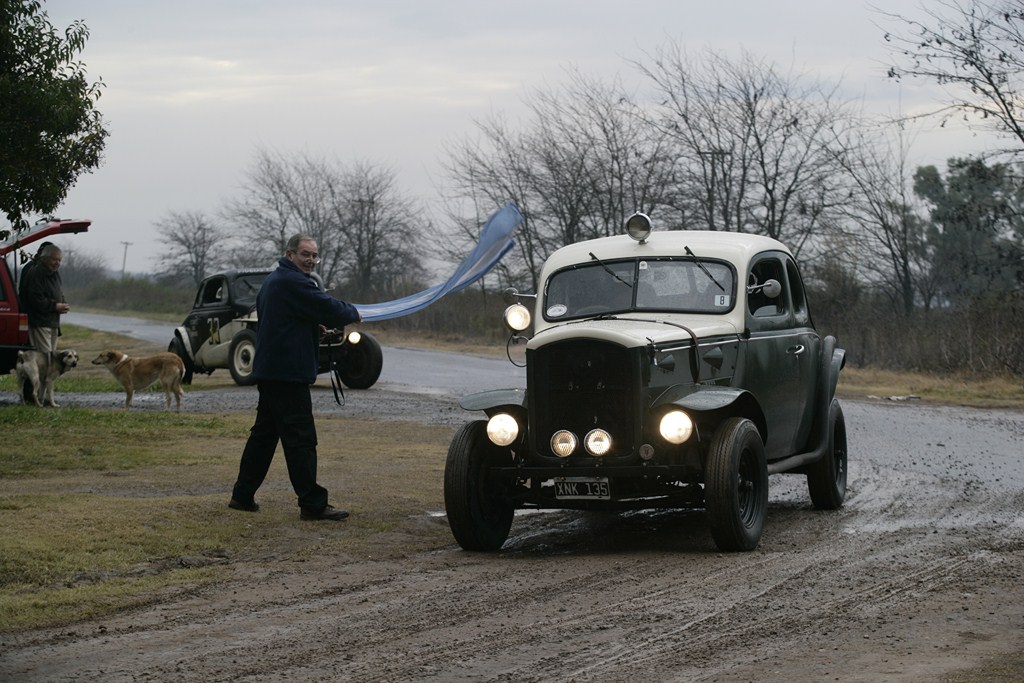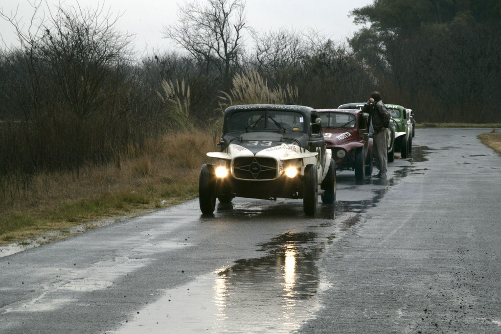 «¿Dónde está el puntero?», clamaba la multitud al borde del camino, sin imaginar el desbande generalizado que se estaba produciendo. Al fin, una inconfundible silueta empezó a recortarse en el horizonte: la mítica «Cachorra» Chevrolet de «Chippy» Breard apareció completando el primer giro, que a la postre fue el único. Después, la inundación… autos cruzados o caídos, fuerzas del orden prestas a detener a los émulos de los Emiliozzi, Bordeu y Gálvez por deteriorar los caminos vecinales, El anfitrión Carlitos Gerbaudo socorriendo junto al infaltable Juan Pablo Vignau a los damnificados con un tractor… confusión general y… ¡abortemos todo, que se nos pasan los lomitos de Rubén!